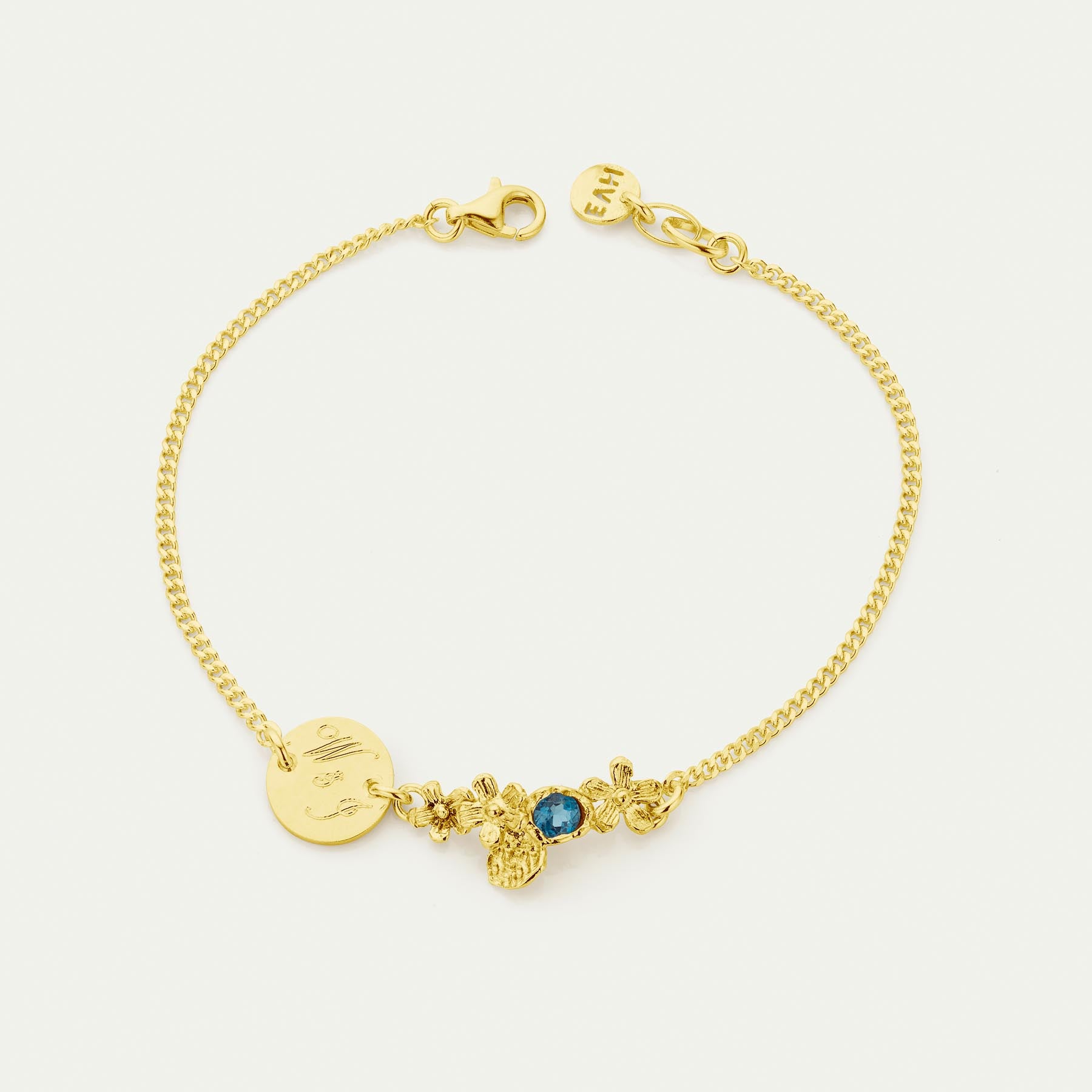 Fijn armbandje in zilver of 18kt geel verguld met blauwe topaas en een gravure naar keuze.