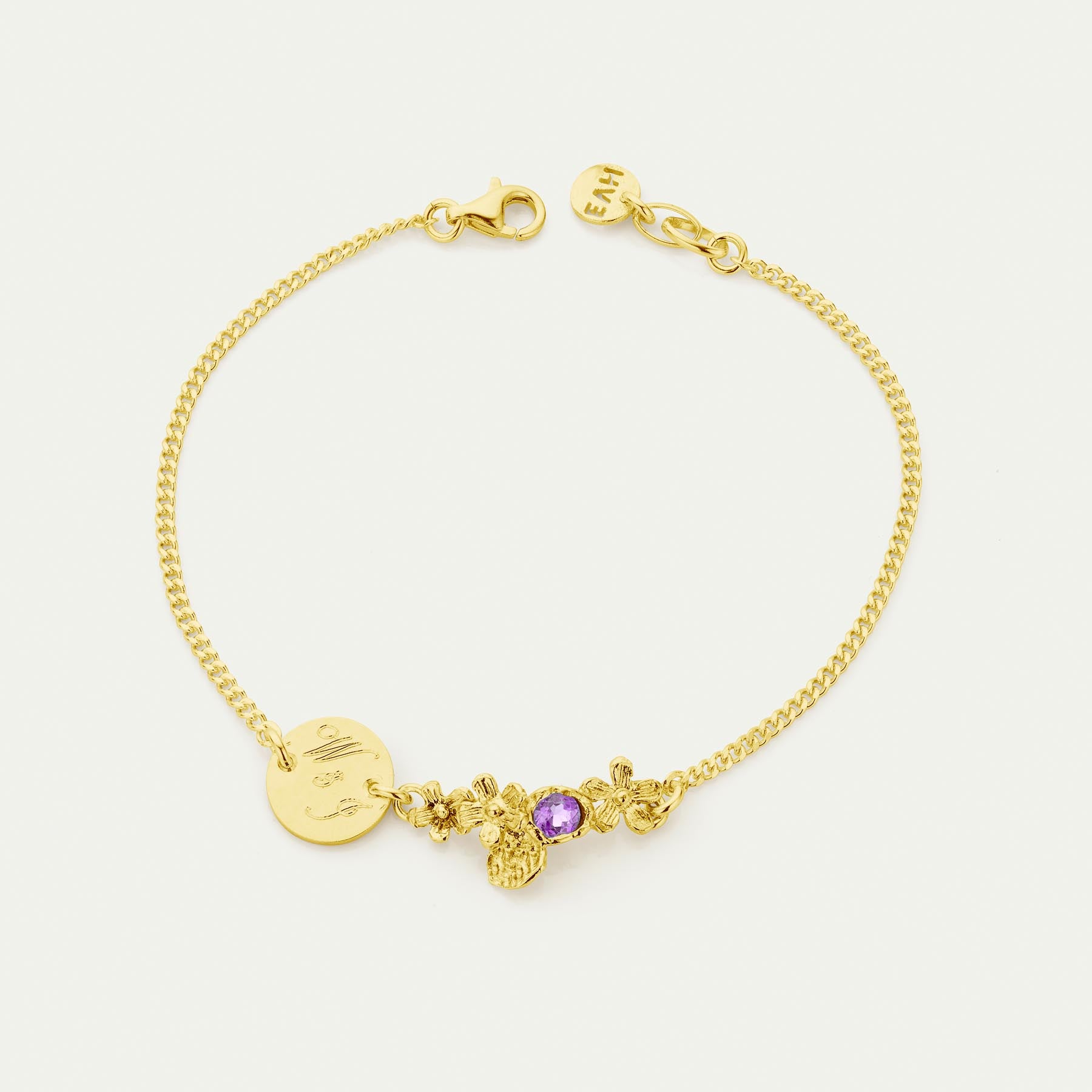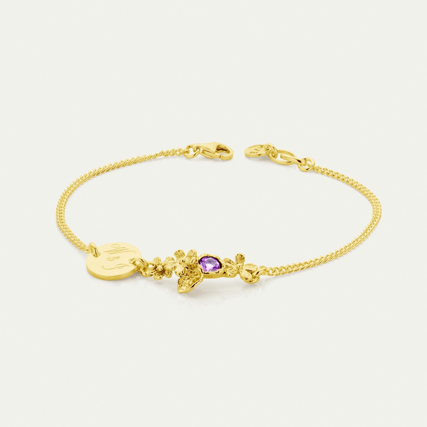 Fijn armbandje in zilver of 18kt geel verguld met paarse amethist en een gravure naar keuze.