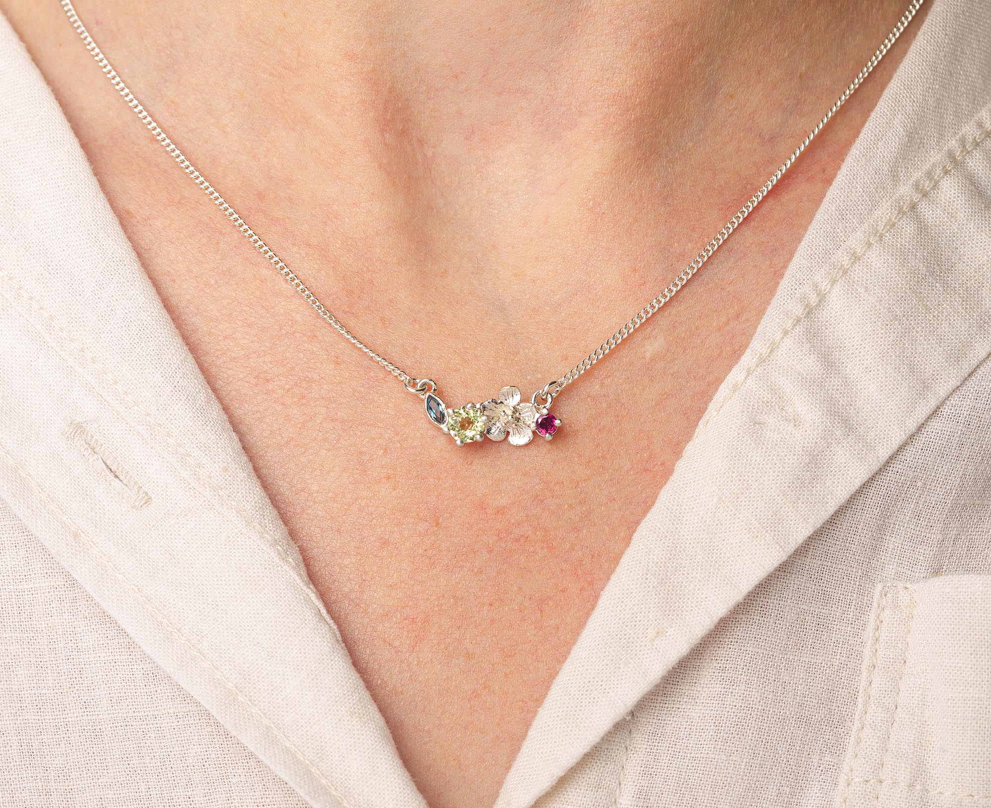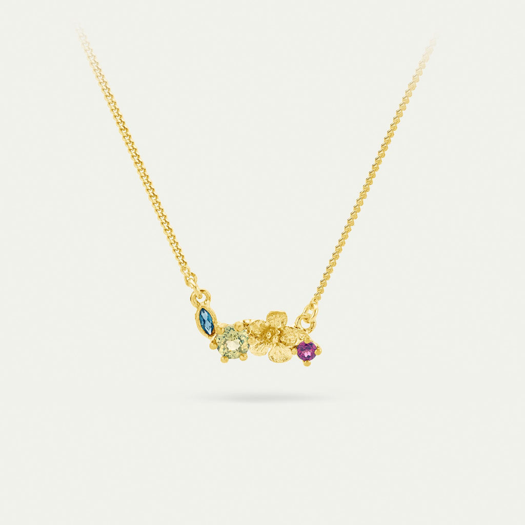 Anemone halsketting in 925 sterling zilver met mali granaat, rhodoliet granaat en topaas. Ook verkrijgbaar in 18kt geel goud verguld.