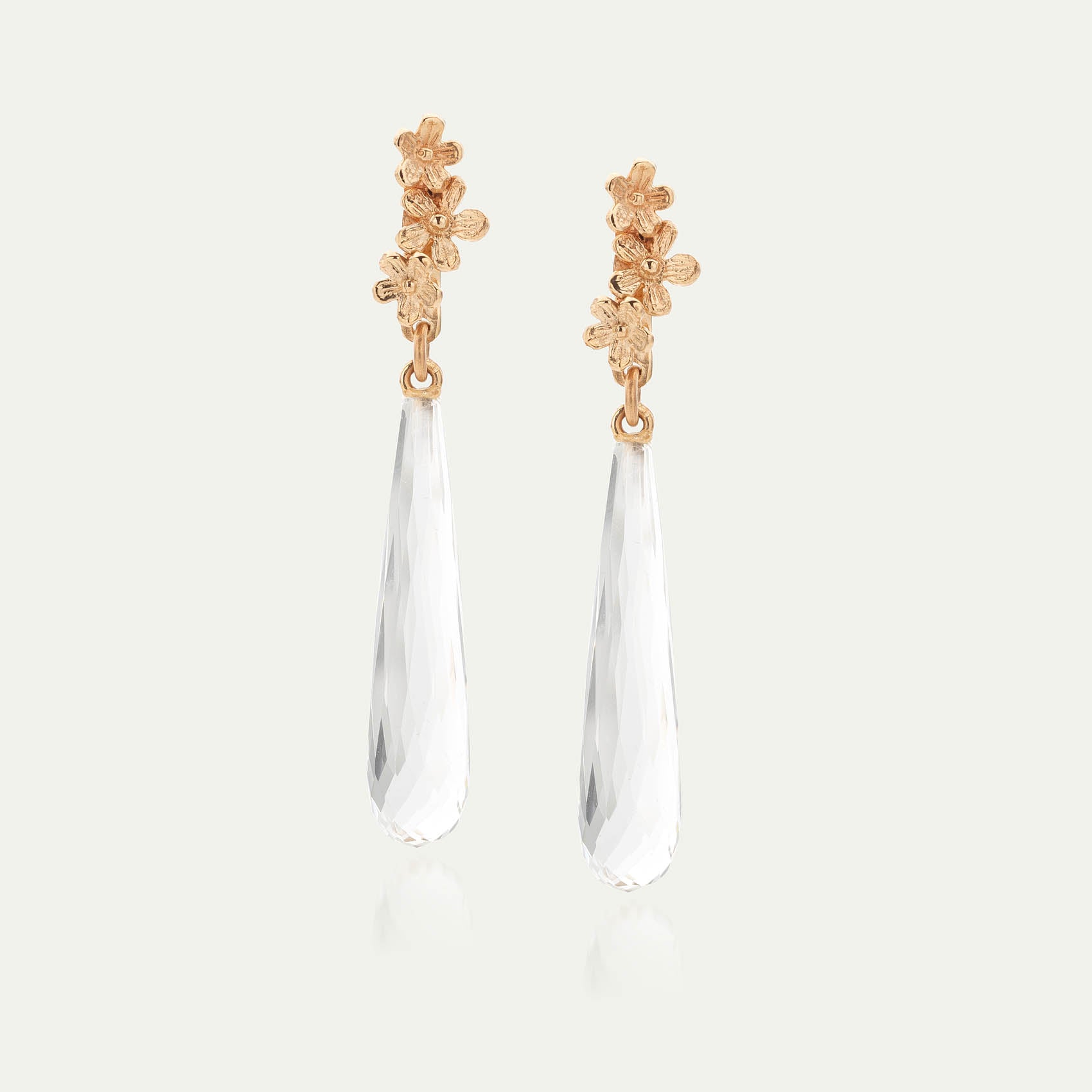 Oorbellen in 18kt rosé goud met facet geslepen bergkristal druppels.