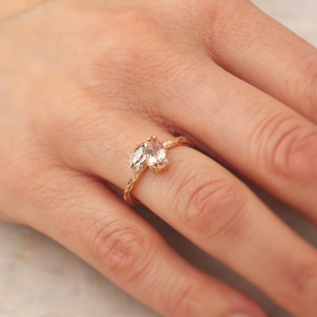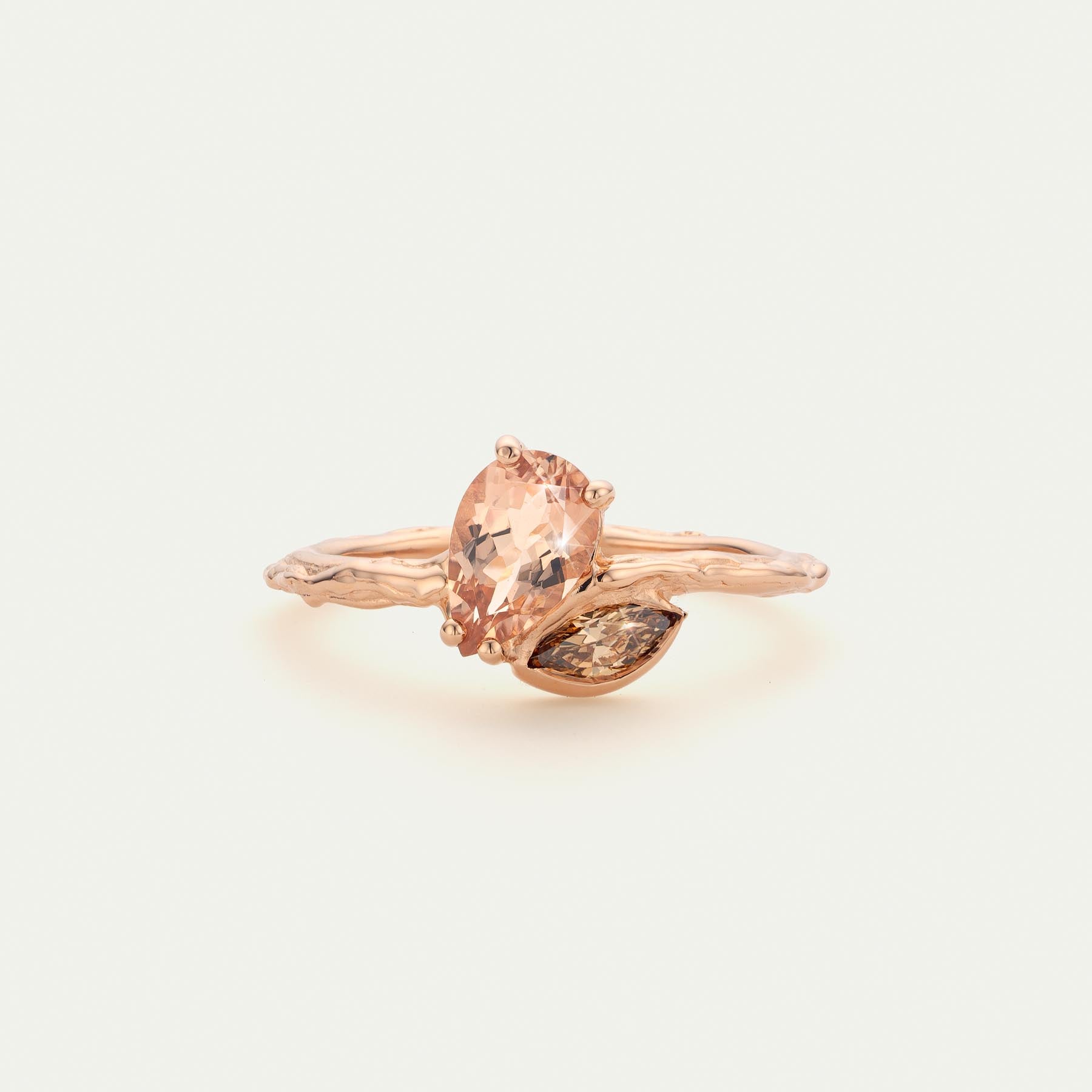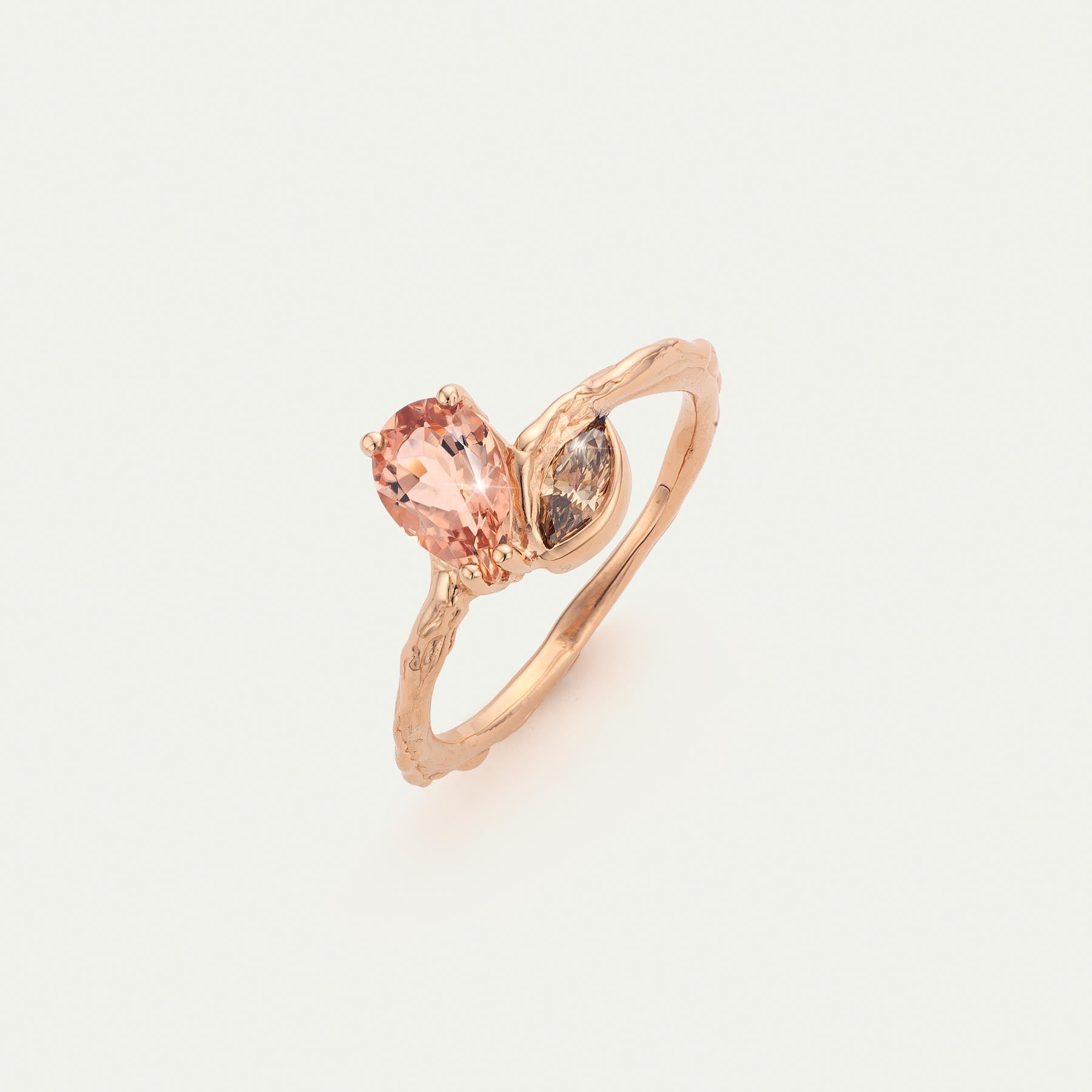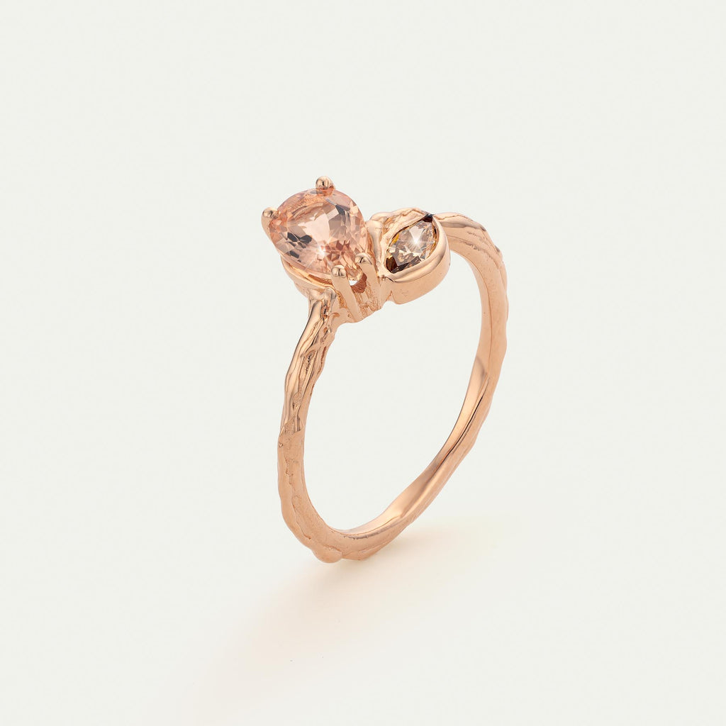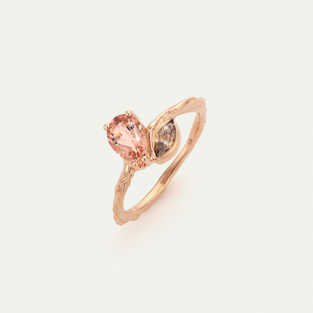 Perzikkleurige peer geslepen toermalijn met bruin marquise diamant van 0.23cts. Zachte kleuren in combinatie met een 18kt rosé gouden basis.