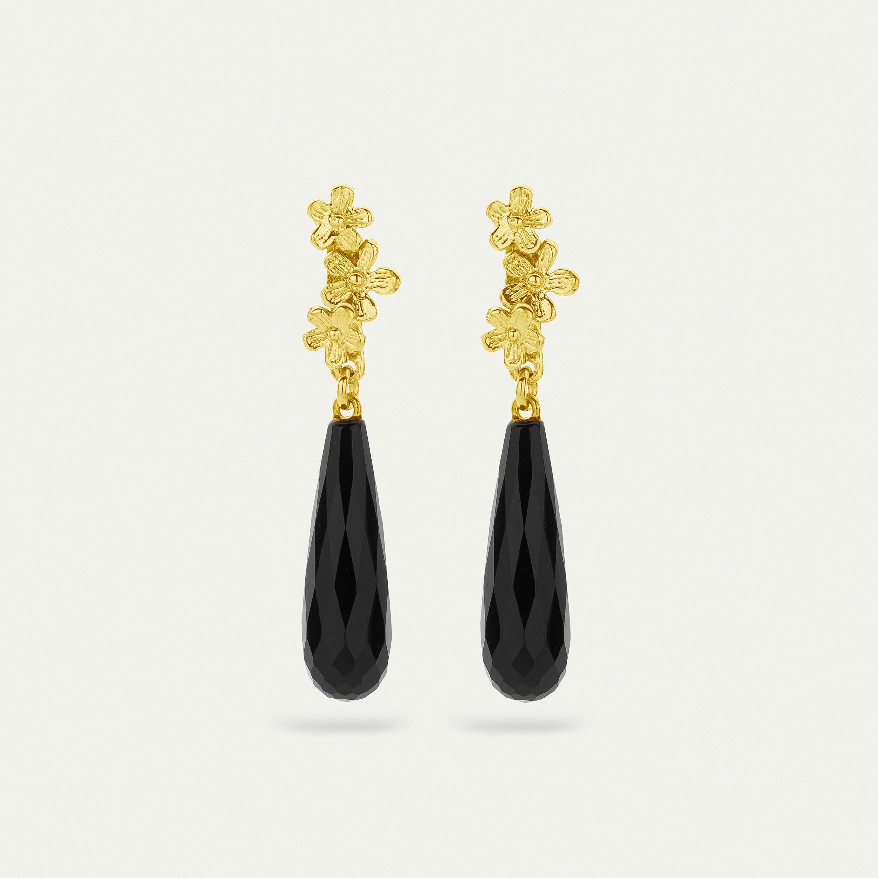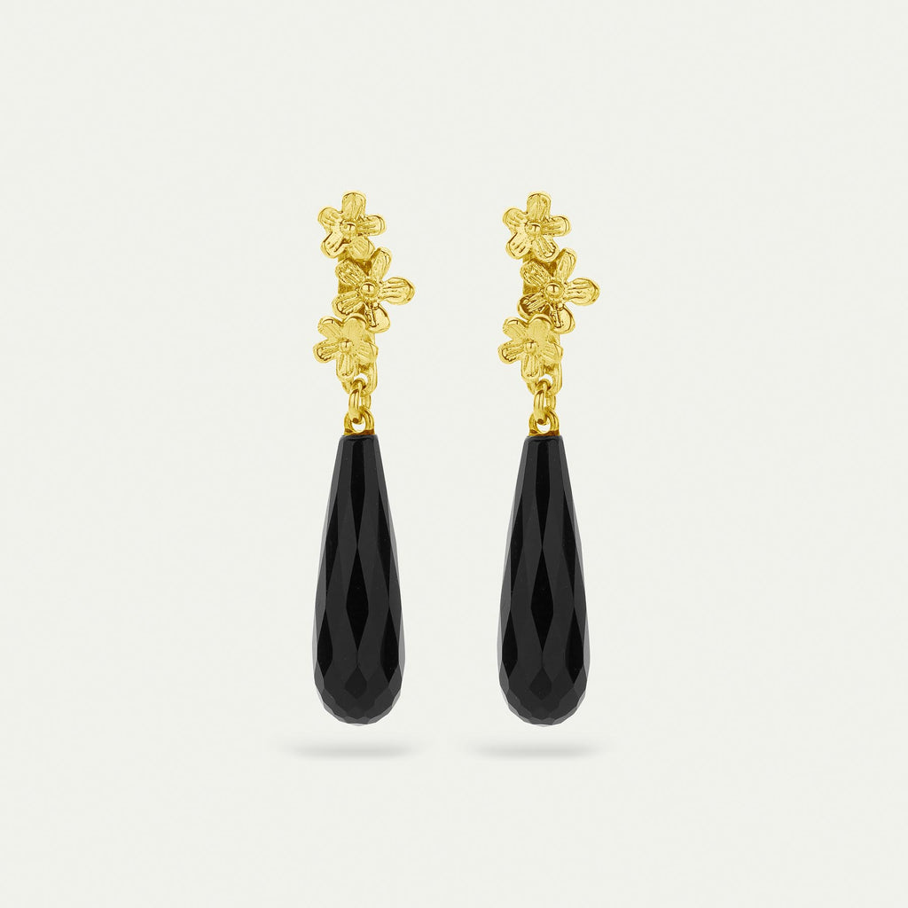 Oorbellen in 925 sterling zilver met drie bloemetjes en een onyx druppel met een lengte van 22 x 8 mm.