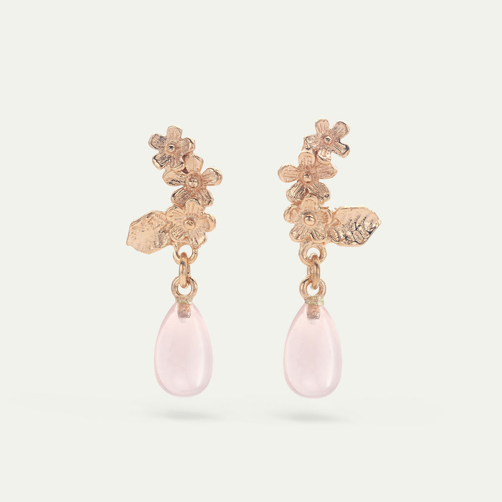 Oorbellen in 18kt rosé goud met rozenkwarts druppels van 10 x 6 mm.